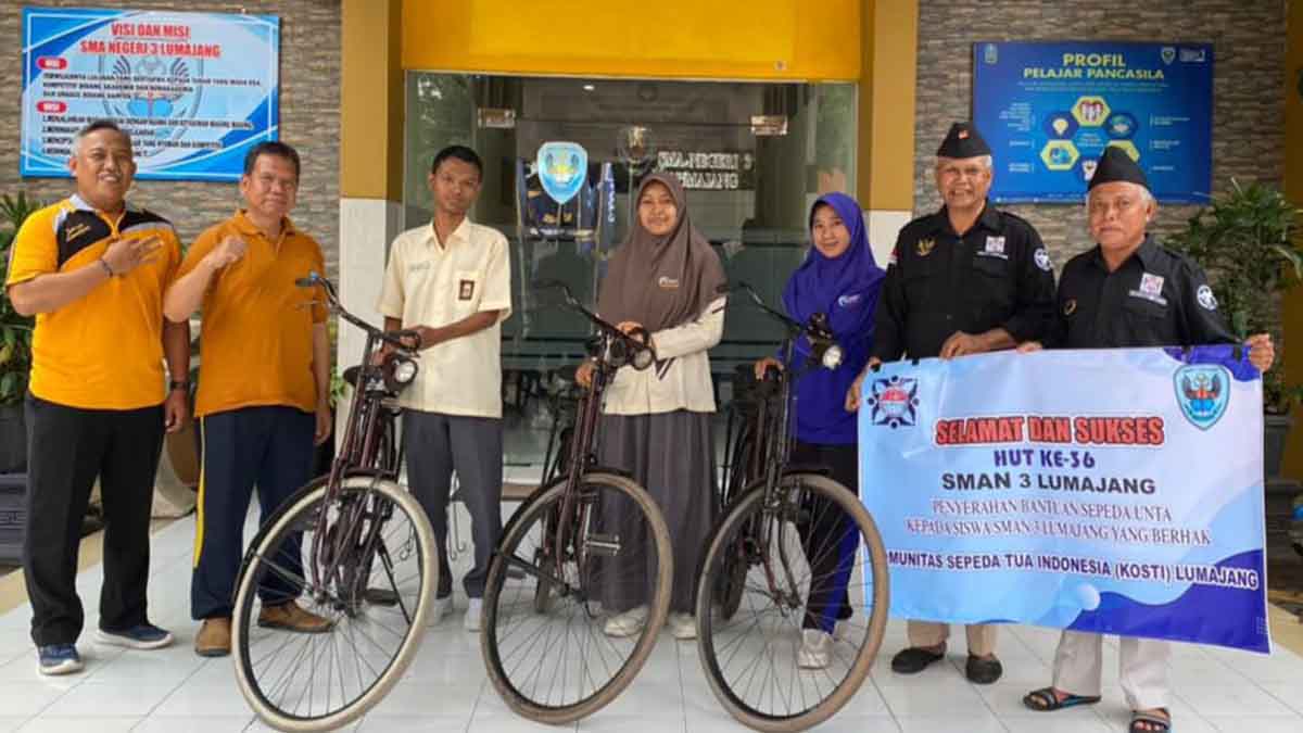 TROBOS.CO | LUMAJANG – Semangat gotong royong dan kepedulian terhadap dunia pendidikan kembali ditunjukkan oleh Komunitas Sepeda Tua Indonesia (KOSTI) Kabupaten Lumajang. Dalam rangka memeriahkan Hari Ulang Tahun (HUT) ke-36 SMA Negeri 3 Lumajang (SMAGA) sekaligus Pengukuhan Ikatan Alumni SMAGA (IKAGA), komunitas ini memberikan bantuan berupa 3 unit sepeda onthel kepada siswa yang membutuhkan sarana transportasi untuk menunjang aktivitas belajar.